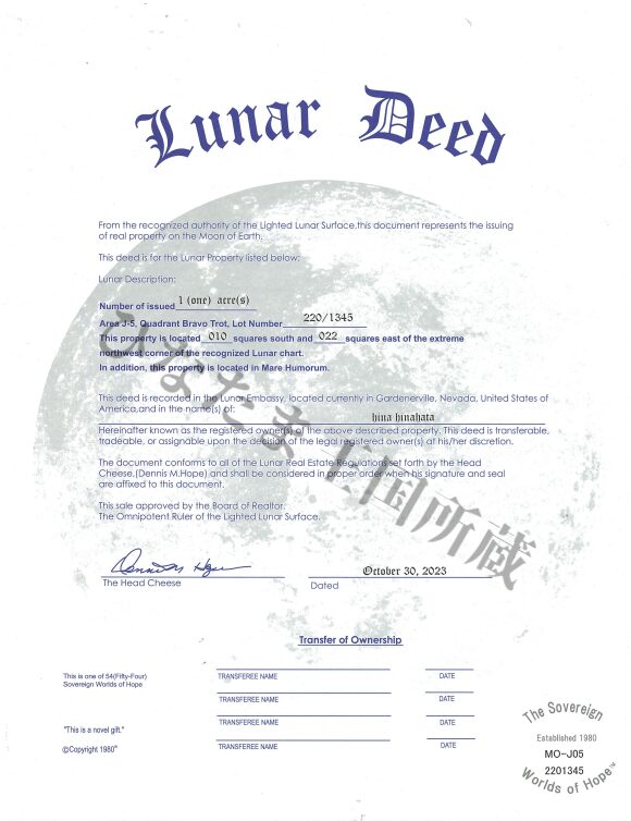 日向端ひな名義で2023年10月30日(ひなたまの誕生日)に発行された月の土地の権利書です。